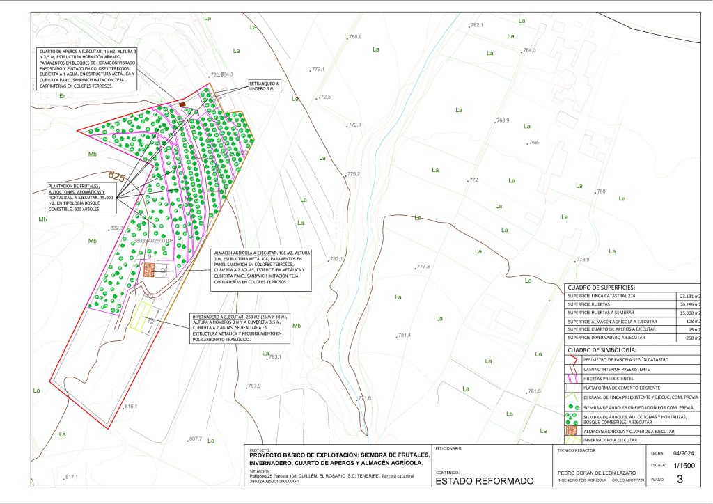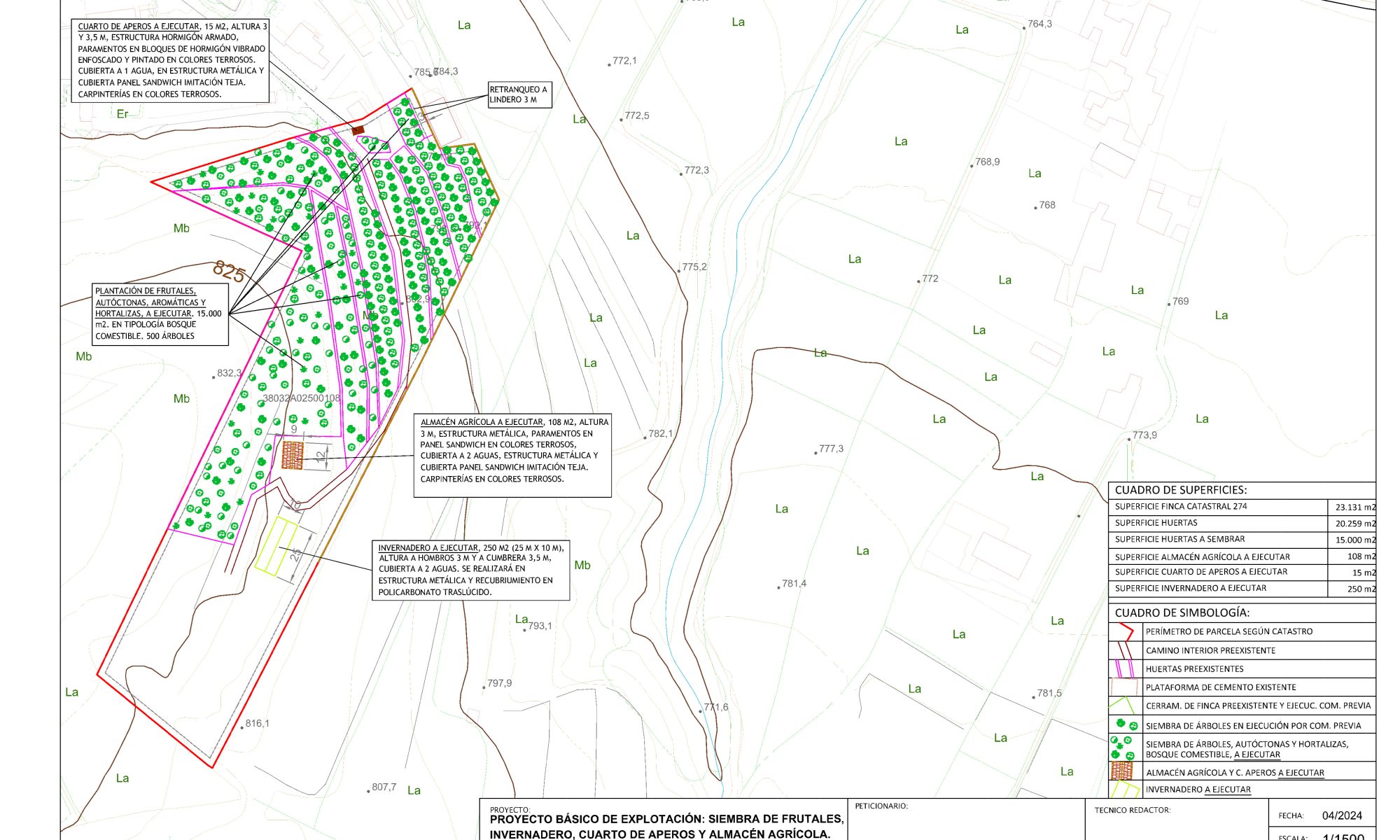 Ejemplo de un proyecto básico para la explotación de una finca: siembra de frutales, invernadero, cuarto de aperos y almacén agrícola, en el municipio del Rosario.